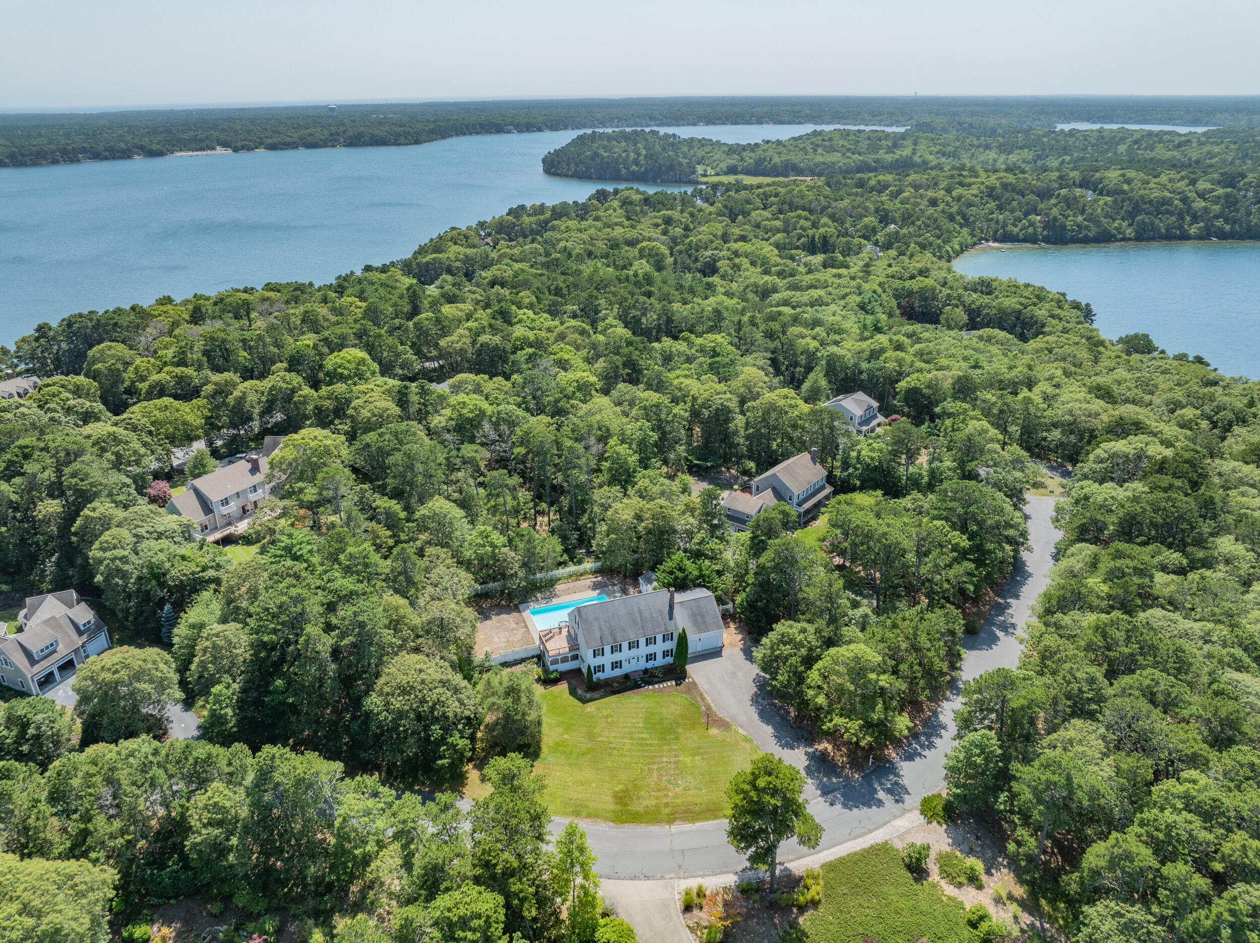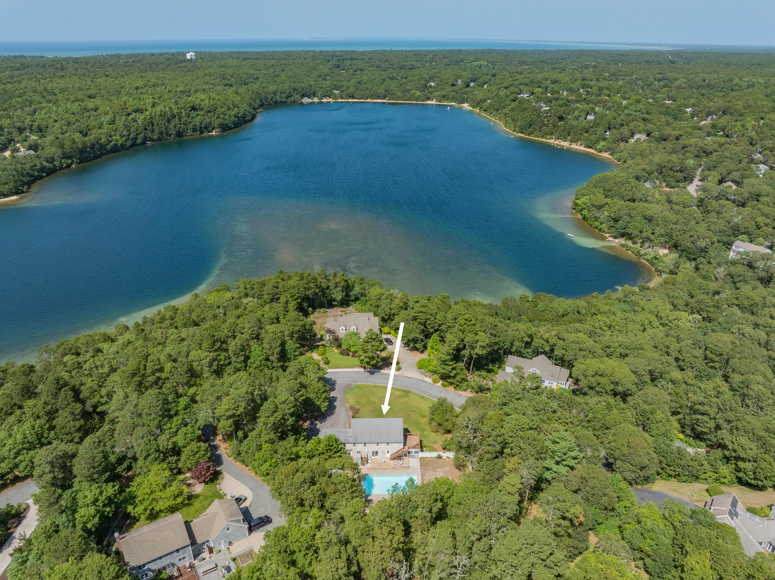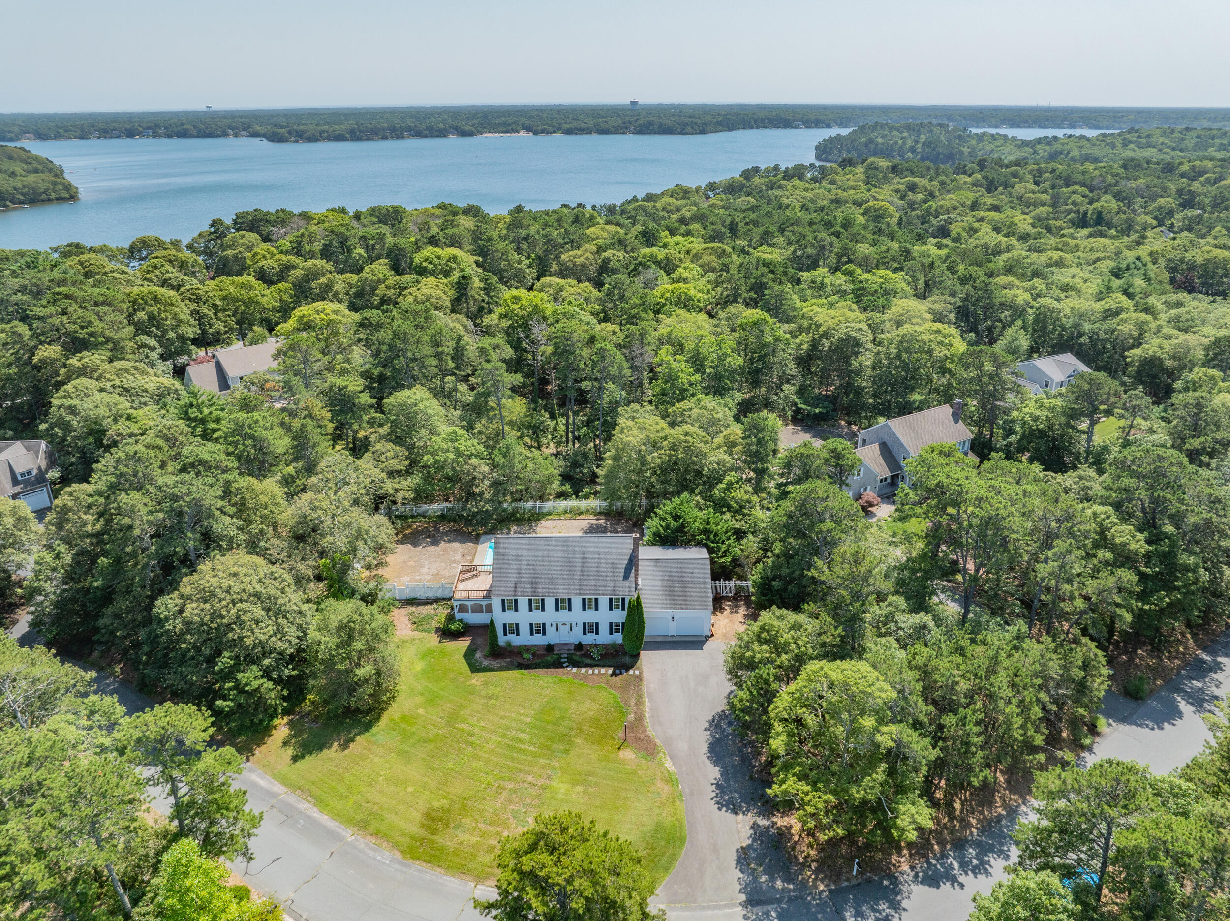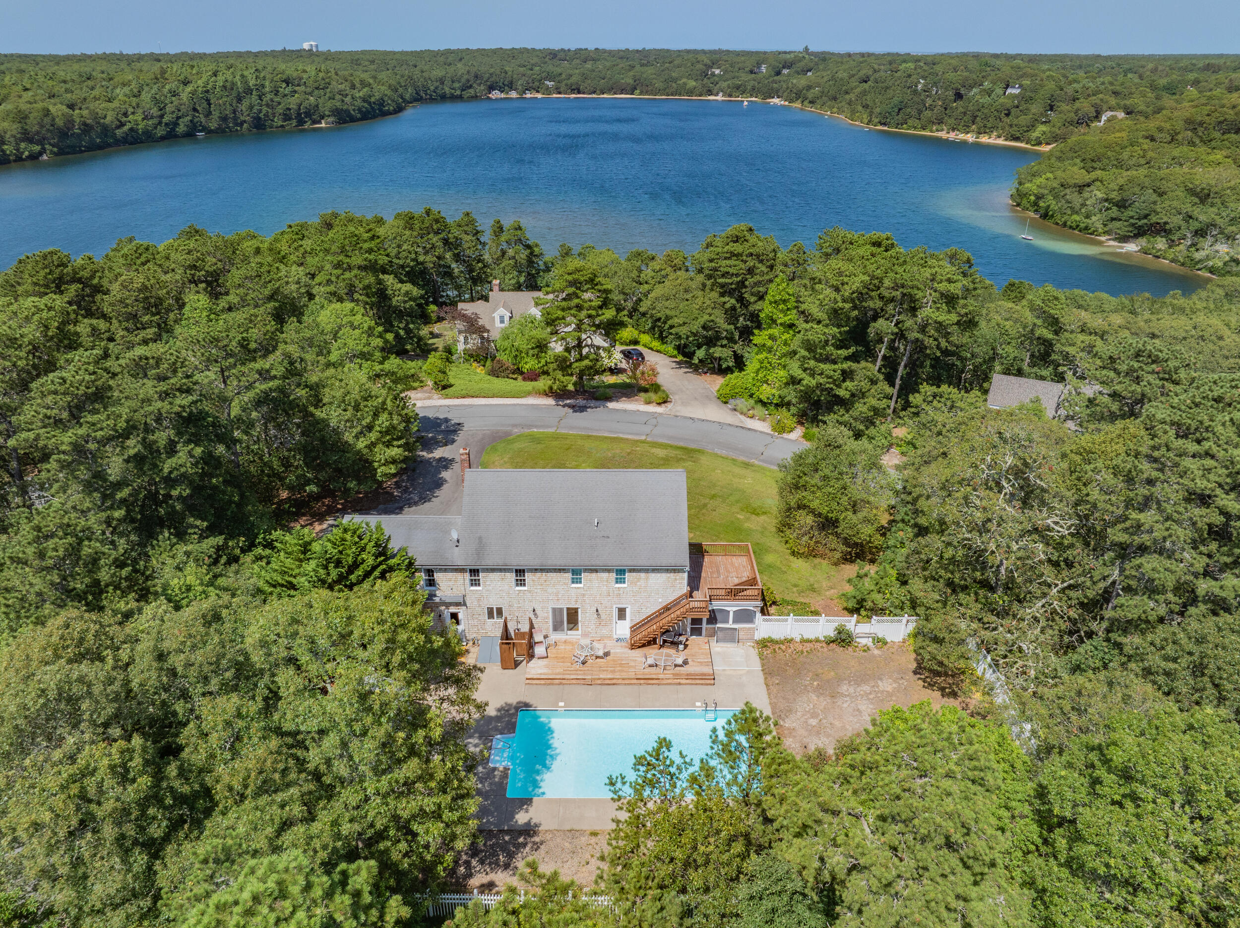 Brewster Prime & coveted MUST SEE cul de sac location positioned between Sheep and Long ponds.Timeless appeal in this young, yr-round (one owner) classic Colonial with unmatched deeded access to Sheep Pond with its unparalleled ~ 535 ft. of private, pristine sandy beach and ~100 ft. on Long Pond for boating & known for enjoying swimming, kayaking, paddle boarding, fishing. Step inside and you are greeted into a spacious 4 bdrms/3baths situated on ~ .95 of an acre with a 2 car gar.FEATURES: Flexible floorplan, beautiful hardwood floors that reflect natural light, convenient 1st flr laundry, a very private, refreshing and heated 20 x 40 sparkling inground pool and shed, outdoor shower, central air and vac., a BRIGHT WALKUP ATTIC for abundant storage etc., a full basement, underground utilities, lawn irrigation, septic for 6 bd.1st floor is comprised of a living room with patio door to sunporch, a fam. rm/office or other, a laundry area, full bath with stall shwr. kitchen with island adjacent to an eat-in room. 2nd floor is comprised of a large primary bdrm with 2 walk-in him & hers closets, a balcony deck and an ensuite full bath, 3 more bdrms & full center bath with tub Never rented but could fetch spectacular income in this Association.