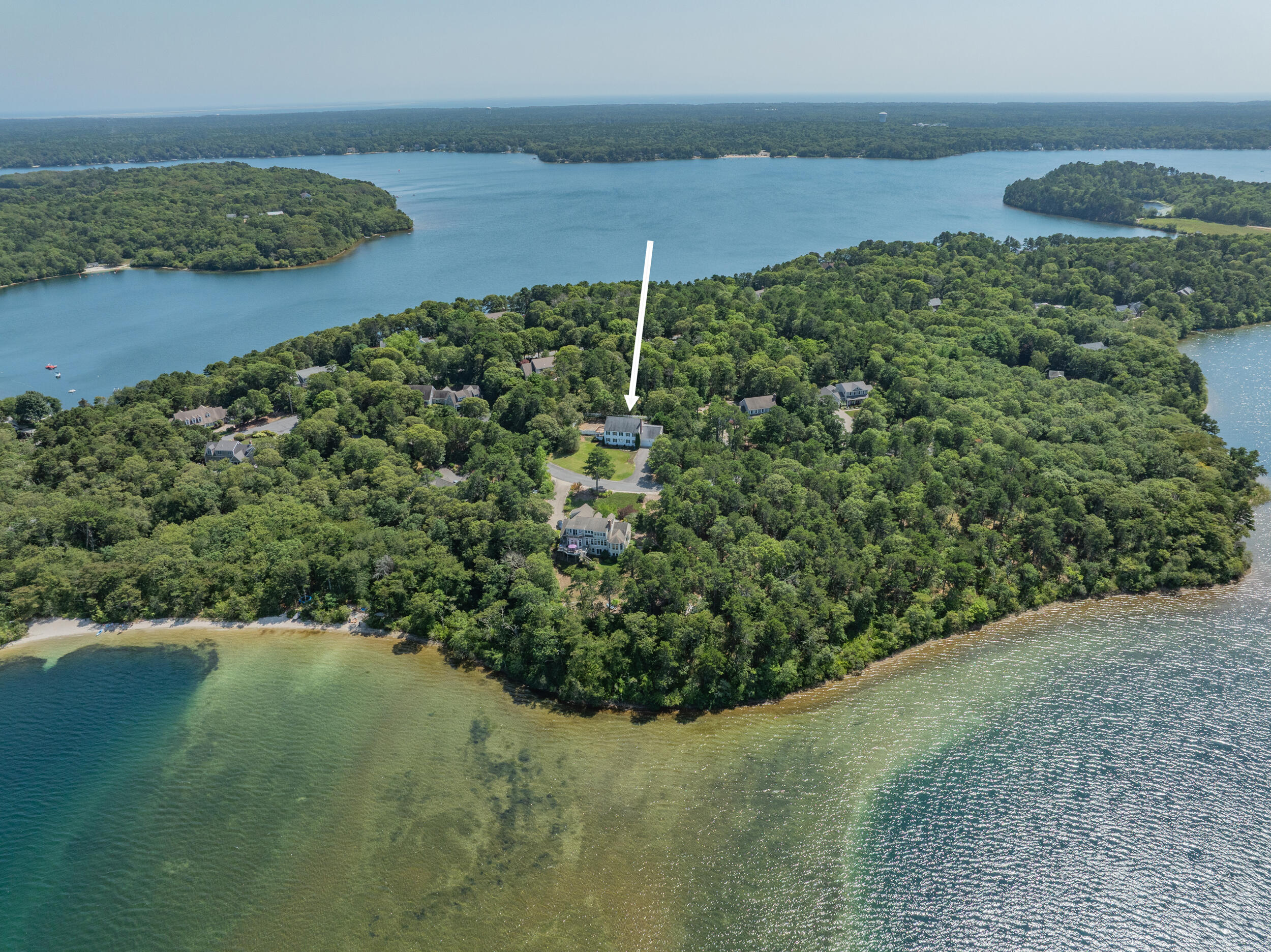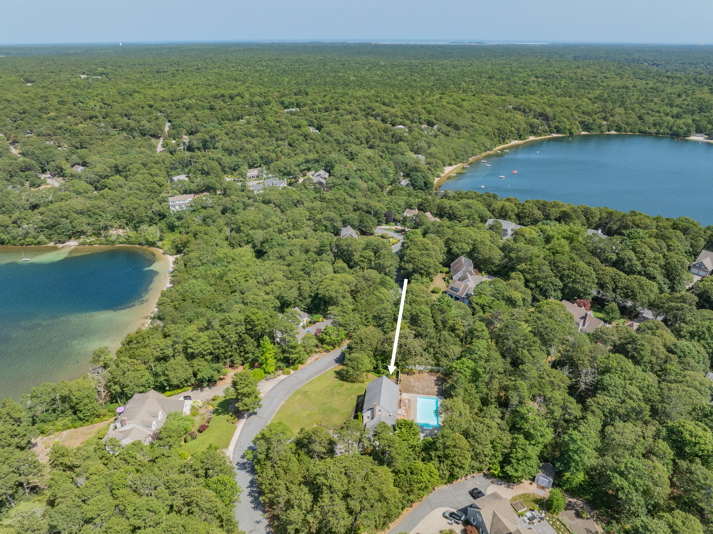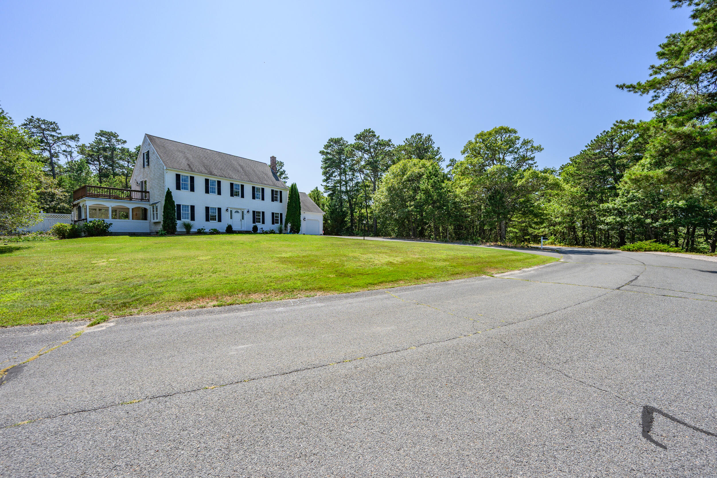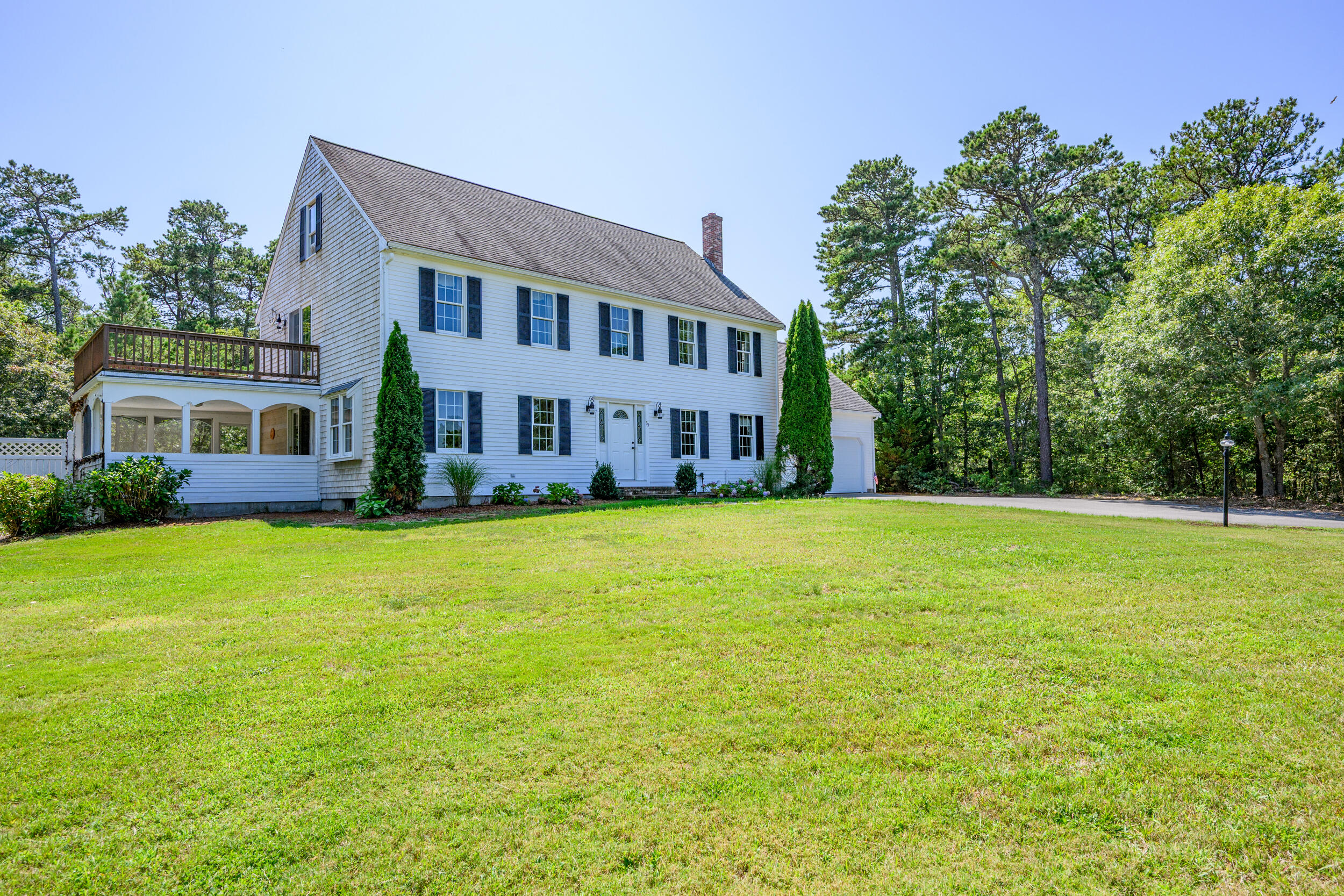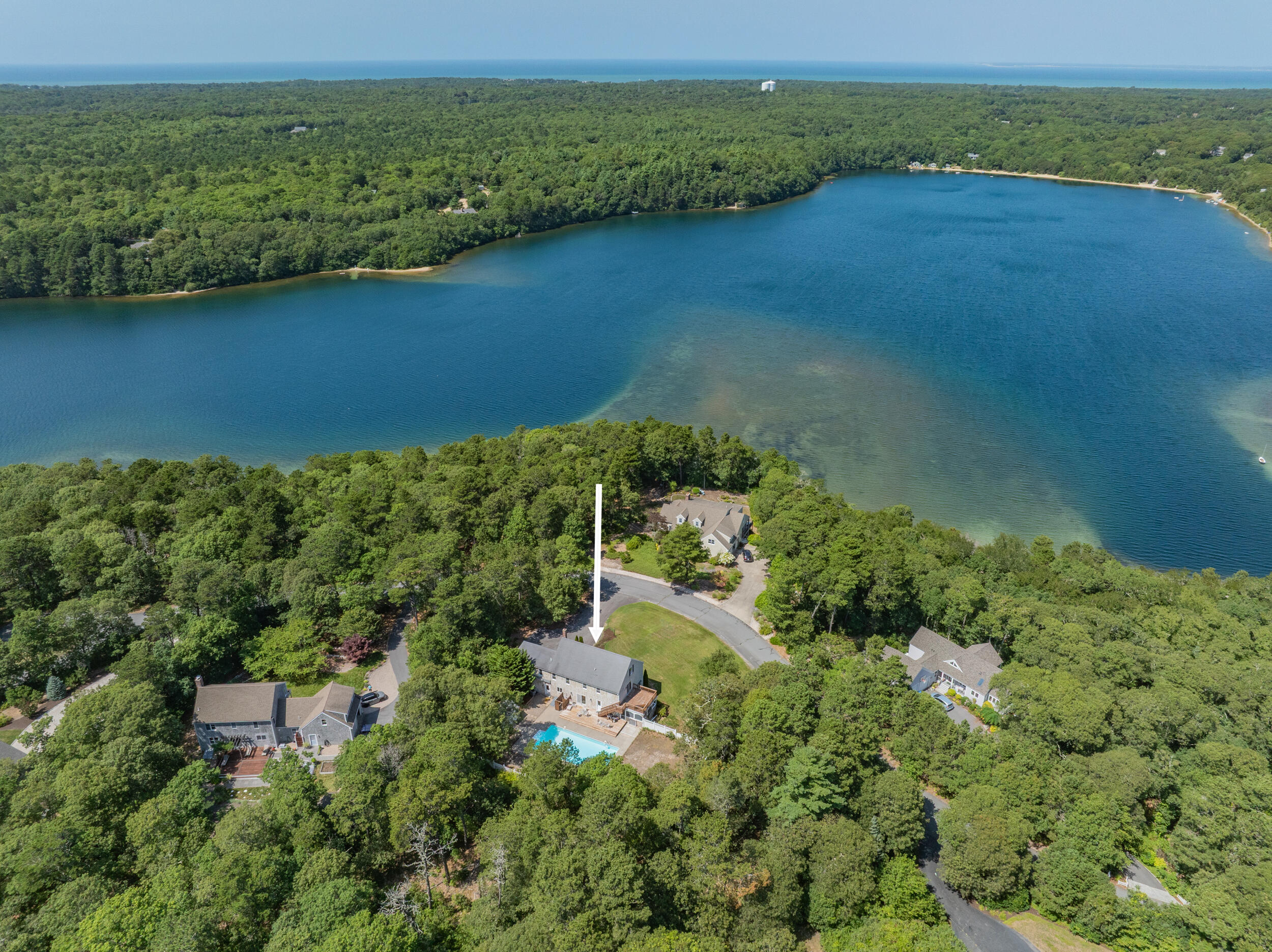 Brewster Prime & coveted MUST SEE cul de sac location positioned between Sheep and Long ponds.Timeless appeal in this young, yr-round (one owner) classic Colonial with unmatched deeded access to Sheep Pond with its unparalleled ~ 535 ft. of private, pristine sandy beach and ~100 ft. on Long Pond for boating & known for enjoying swimming, kayaking, paddle boarding, fishing. Step inside and you are greeted into a spacious 4 bdrms/3baths situated on ~ .95 of an acre with a 2 car gar.FEATURES: Flexible floorplan, beautiful hardwood floors that reflect natural light, convenient 1st flr laundry, a very private, refreshing and heated 20 x 40 sparkling inground pool and shed, outdoor shower, central air and vac., a BRIGHT WALKUP ATTIC for abundant storage etc., a full basement, underground utilities, lawn irrigation, septic for 6 bd.1st floor is comprised of a living room with patio door to sunporch, a fam. rm/office or other, a laundry area, full bath with stall shwr. kitchen with island adjacent to an eat-in room. 2nd floor is comprised of a large primary bdrm with 2 walk-in him & hers closets, a balcony deck and an ensuite full bath, 3 more bdrms & full center bath with tub Never rented but could fetch spectacular income in this Association.